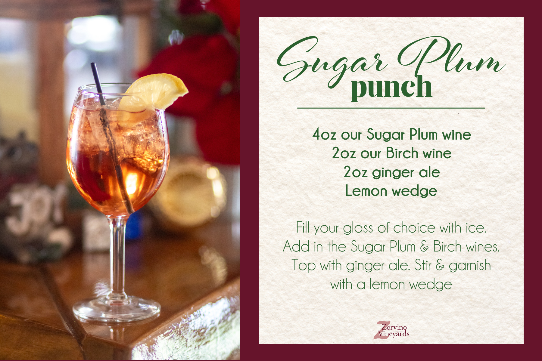 A wine cocktail with a festive twist! Our Sugar Plum Punch features our Sugar Plum wine – 100% plum wine, aged with an aromatic blend of baking spices including cinnamon, nutmeg, clove, ginger, & cardamom, and fortified to 18%. It’s topped off with our Birch wine for the warm caramel undertones, a splash of ginger ale for a little kick, and garnished with a lemon wedge to cut through the sweetness. It’s fruity upfront, followed by those warm spice & smooth caramel notes, and finishes with the lingering taste of ginger. The perfect beverage for your holiday gatherings!