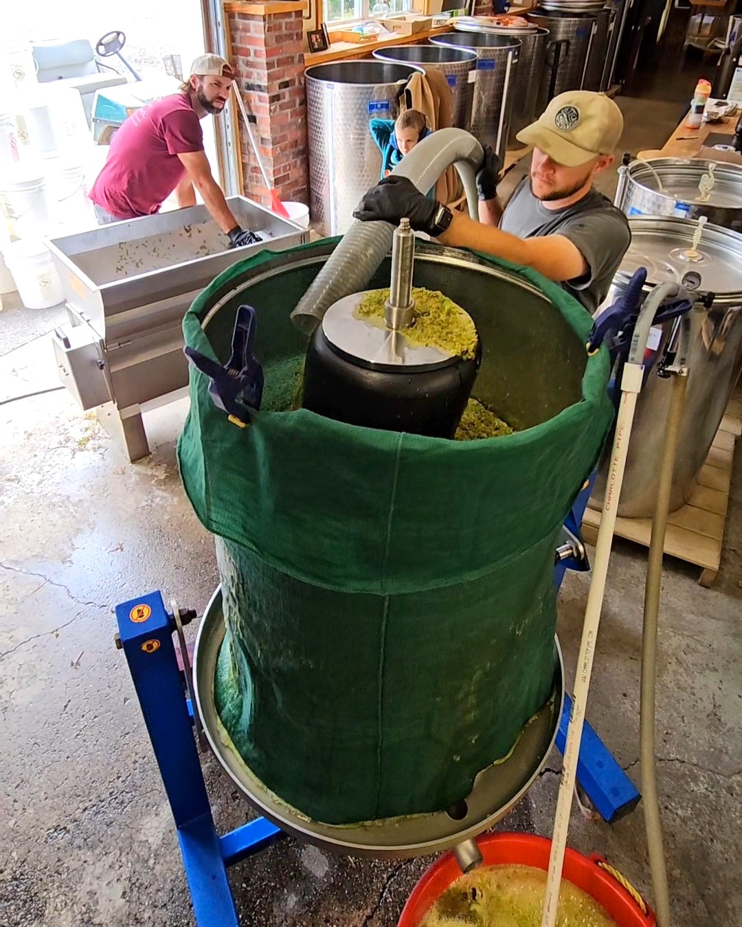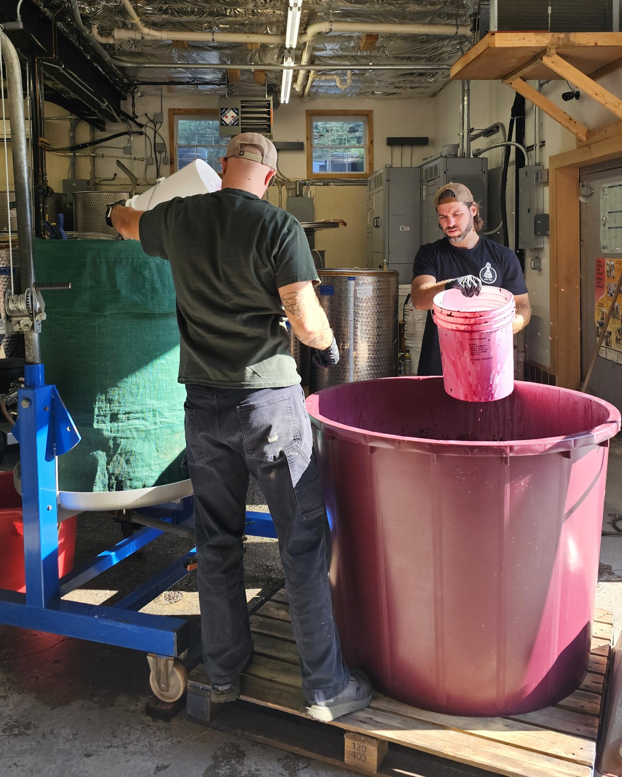 When the juice is done fermenting, we manually scoop buckets of skins & juice into our press. The inner bladder fills with air and squeezes the skin against the outer screen, allowing us to extract as much wine as possible. The wine flows out into a bucket and is then pumped into stainless steel tanks.